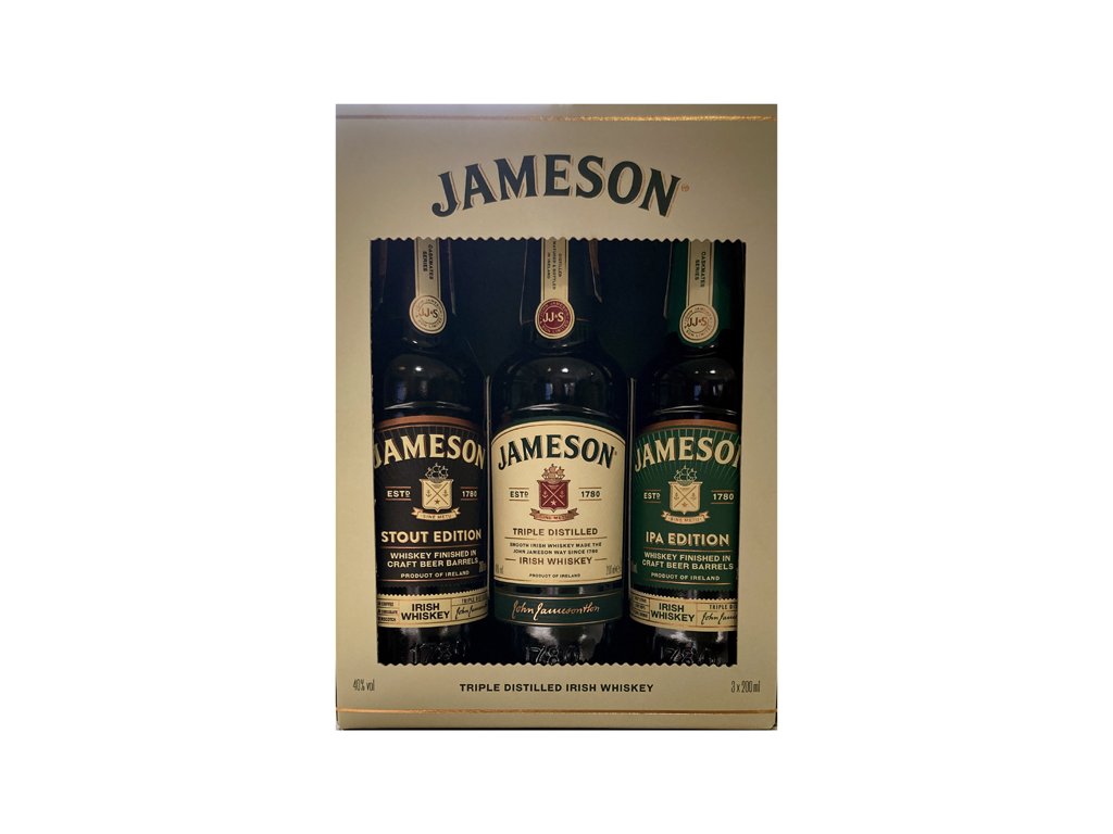 Balení obsahuje 3 lahve - Jameson Stout Edition, Jameson a Jameson IPA Edition.
