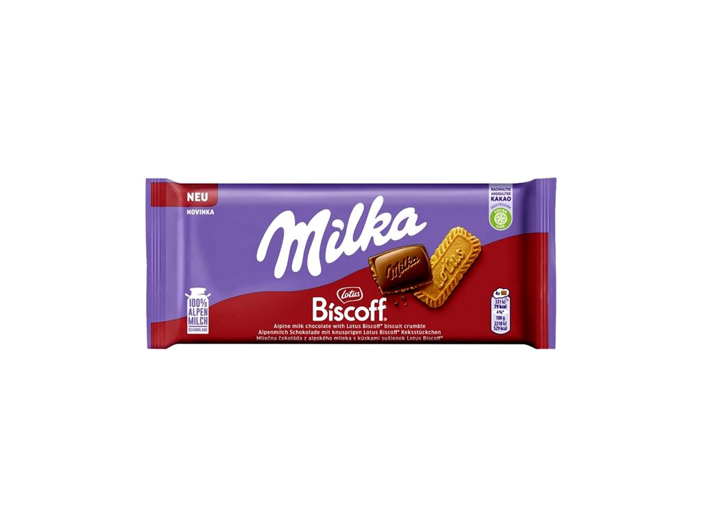 Milka Biscoff je s kousky karamelizovaných sušenek (17 %) v mléčné čokoládě z alpského mléka.