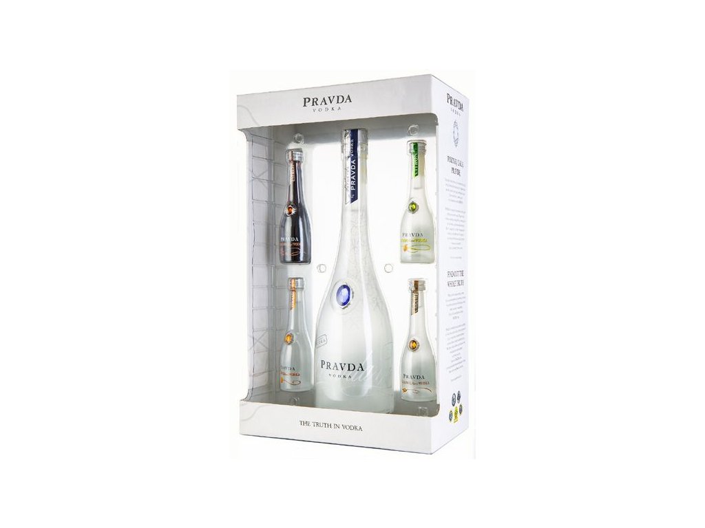 Nad tradiční recepturou dohlíží přísně již šestá generace rodiny Kulaků. Mají zde jedny z nejlepších podmínek na výrobu vodky. Karpaty dávají velmi čistou pramenitou vodu, žito se šetrně sklízí a neošetřuje se jakýmkoliv způsobem, což dává vodce přírodní, měkou a jemnou chuť. Vodka Pravda se pětkrát destiluje a je opravdu jedna z nejhladších a nejčistších vodek, které kdy byly vyrobeny. Dárkové balení obsahuje 4 miniaturky 0,05l ochucené vodky Pravda - konkrétně: Pomeranč, Brusinka, Kokos, Broskev.
